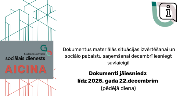 Gulbenes novada sociālais dienests aicina klientus savlaicīgi iesniegt dokumentus materiālās situācijas izvērtēšanai un sociālo pabalstu saņemšanai decembra mēnesī. Dokumentus jāiesniedz līdz 2025. gada 22.decembrim (pēdējā diena).