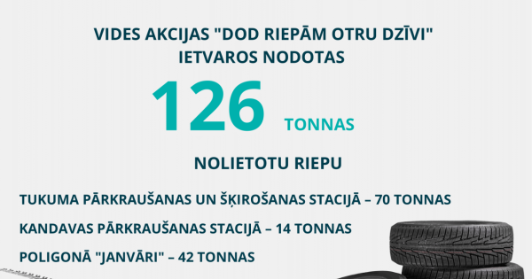 Akcijas periodā kopā nodotas 126 tonnas nolietotu riepu. Paldies ikvienam, kurš piedalījās riepu nodošanas akcijā, kopā mēs veidojam zaļāku nākotni! Šķiro – vairo labo!