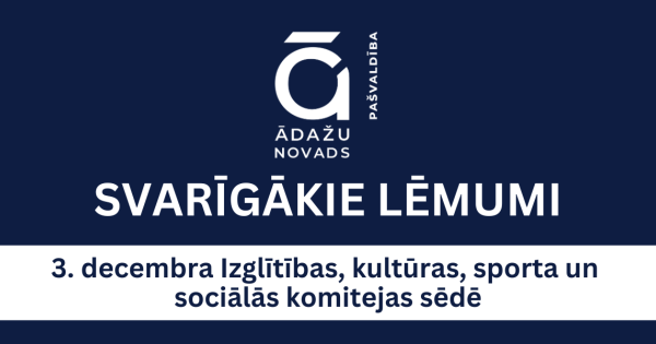 Šodien Ādažu novada domes Izglītības, kultūras, sporta un sociālās komitejas sēdē tika izskatīti 11 jautājumi, tai skaitā trīs jautājumi – slēgtajā daļā.