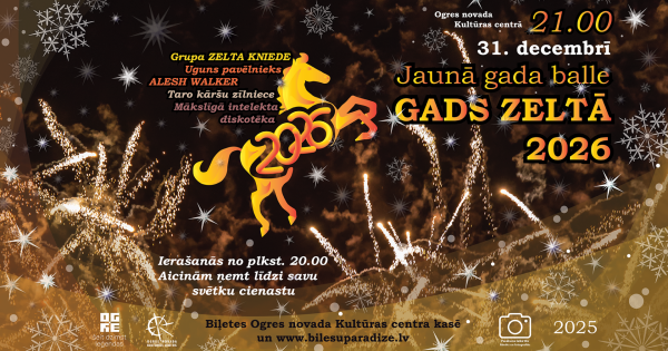 Kad kalendārs noslēdz vēl vienu apli, Ogres novada Kultūras centrs aicina uz vienu no gaidītākajiem gada notikumiem – Jaunā gada balli “Gads Zeltā 2026” 31. decembrī plkst. 21.00.