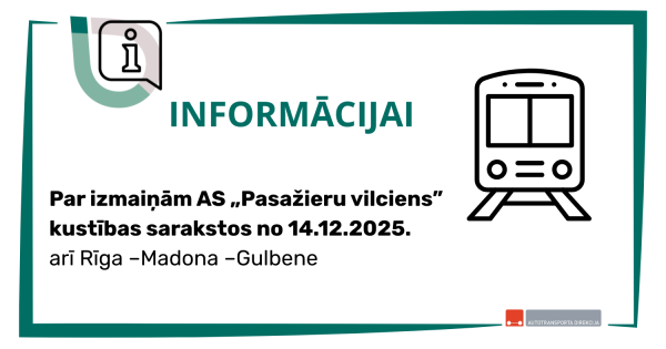 Saskaņā ar Ministru kabineta 2016.gada 15.jūlija noteikumiem Nr.472 „Publiskās lietošanas dzelzceļa infrastruktūras jaudas sadales noteikumi”, Ministru kabineta 2010.gada 13.jūlija noteikumu Nr.634 „Sabiedriskā transporta pakalpojumu organizēšanas kārtība maršrutu tīklā” nosacījumiem un atsaucoties uz Sabiedriskā transporta 2014.gada 10.janvāra lēmuma Nr.3 „Par operatīvo lēmumu izpildes nodrošināšanu” 3.1.2.punktu, AS “Pasažieru vilciens” ir iesniedzis izmaiņas vilcienu kustības sarakstos no 2025.gada 14.decembra: