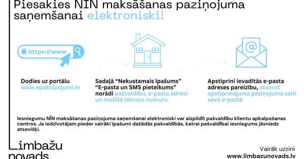 Limbažu novada pašvaldība lūdz nekustamā īpašuma nodokļa maksātājus, kuri līdz šim NĪN maksāšanas paziņojumus saņēma papīra formātā, izmantot iespēju maksāšanas paziņojumus par nekustamā īpašuma nodokli saņemt elektroniski paziņojot savu e-pasta adresi (pasts@limbazunovads.lv vai portālā www.epakalpojumi.lv sadaļā Nekustamais īpašums, vai aktivizējot savu e-adresi portālā www.latvija.lv. )