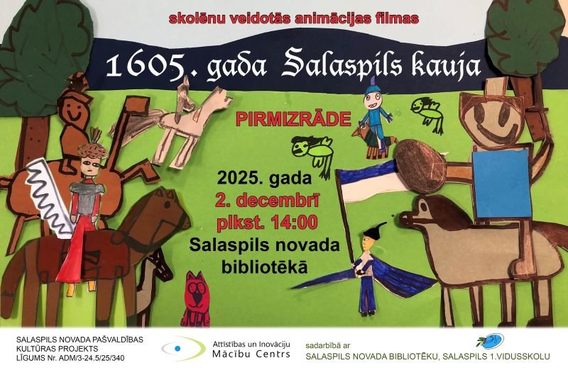 2. decembrī Salaspils novada bibliotēkā notika skolēnu veidotās animācijas filmas “1605. gada Salaspils kauja” pirmizrāde, ko ar dziesmu atklāja Salaspils folkloras kopa “Daugaviņa”. Projekta galvenais elements bija animācijas filmas veidošana un pirmizrāde, noskatoties pašu veidoto filmu. Skolēni atcerējās, kā kopā ar animatori Daci Liepu un viņas kolēģiem iesaistījās stāsta izveidē, galveno filmas varoņu un fonu zīmēšanā un ainu filmēšanā. Filmas skaņu celiņu mūzikas skolotājas Gitas Kalniņas vadībā ieskaņoja Salaspils 1. vidusskolas folkloras kopa. Šī bērnu veidotā animācijas filma ir spilgts piemērs tam, kā vēsturi var atainot saistošā veidā un kā jaunā paaudze var izmantot mūsdienīgus līdzekļus, lai godinātu pagātni. Tā bija izdevība mācīties darot, spēlējoties un radot ko paliekošu. Paldies Salaspils 1. vidusskolai par atbalstu filmas tapšanā! Animācijas filma papildinās Salaspils novada bibliotēkas interaktīvo ekspozīciju “Salaspils novada vēstures stāsts”.