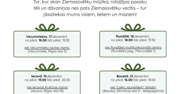 - Vecumnieki – 17. decembrī plkst. 18.00-19.30 pie Vecumnieku tautas nama (Vecumnieki, Rīgas iela 5)