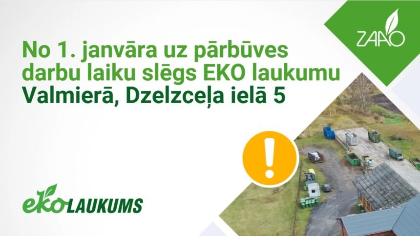No 2026. gada 1. janvāra SIA “ZAAO” (ZAAO) EKO laukums Valmierā, Dzelzceļa ielā 5, uz laiku būs slēgts teritorijas pārbūves darbu dēļ. Plānots, ka tas atkal būs pieejams 2027. gadā. Pēc darbu pabeigšanas gaidīsim jūs atjaunotā, plašākā un modernākā EKO laukumā, kas būs ērts, mūsdienīgs un pieejams ikvienam apmeklētājam.