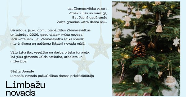 Sirsnīgus, jauku domu piepildītus Ziemassvētkus un laimīgu 2026. gadu visiem mūsu novada iedzīvotājiem. Lai Ziemassvētku laiks sniedz mierinājumu un gaišumu ikkatrā novada mājā!