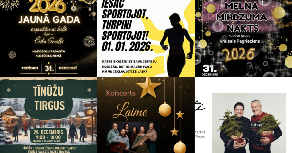 Ziemas balle Jumpravā – plkst. 22.00 Jumpravas pagasta Kultūras namā notiks Ziemas balle pie galdiņiem. Par muzikālo noformējumu rūpēsies Ēriks Budēvics no grupas “Hameleoni”, Indra Raila un DJ MFZ. Biļešu cena: iepriekšpārdošanā – 8,00 EUR, pasākuma dienā – 10,00 EUR. Biļetes iepriekšpārdošanā pieejamas no 9. līdz 23. decembrim Jumpravas pagasta Kultūras namā (zvanot pa tālruni 25450061).