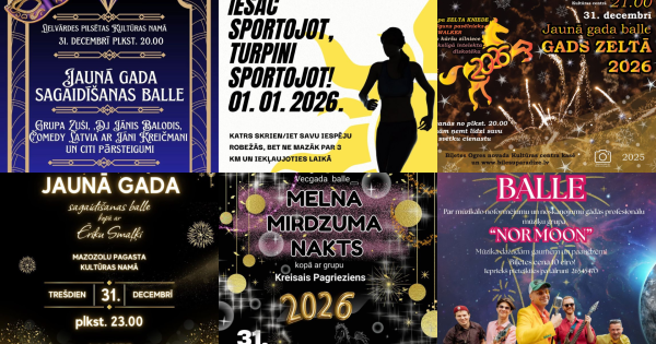 Vecgada balle “Melnā mirdzumā” Birzgalē – plkst. 23.00 Birzgales Tautas namā. Jauno gadu sagaidīsim ar labu mūziku, deju soļiem un lielisku noskaņu kopā ar grupu “Kreisais Pagrieziens”. Dress code: melns ar spīdumu, mirdzuma vai glamūra akcentu. Ieeja: 5 EUR. Galdiņu rezervācija līdz 23. decembrim: 29424612. Lai mirdz gan tērpi, gan noskaņojums!