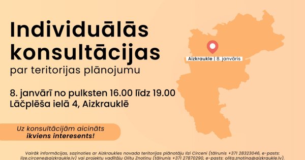 8. janvārī no pulksten 16.00 līdz 19.00 Aizkraukles novada iedzīvotāji un zemes īpašnieki tiek aicināti klātienē konsultēties par jauno Aizkraukles novada teritorijas plānojumu.
