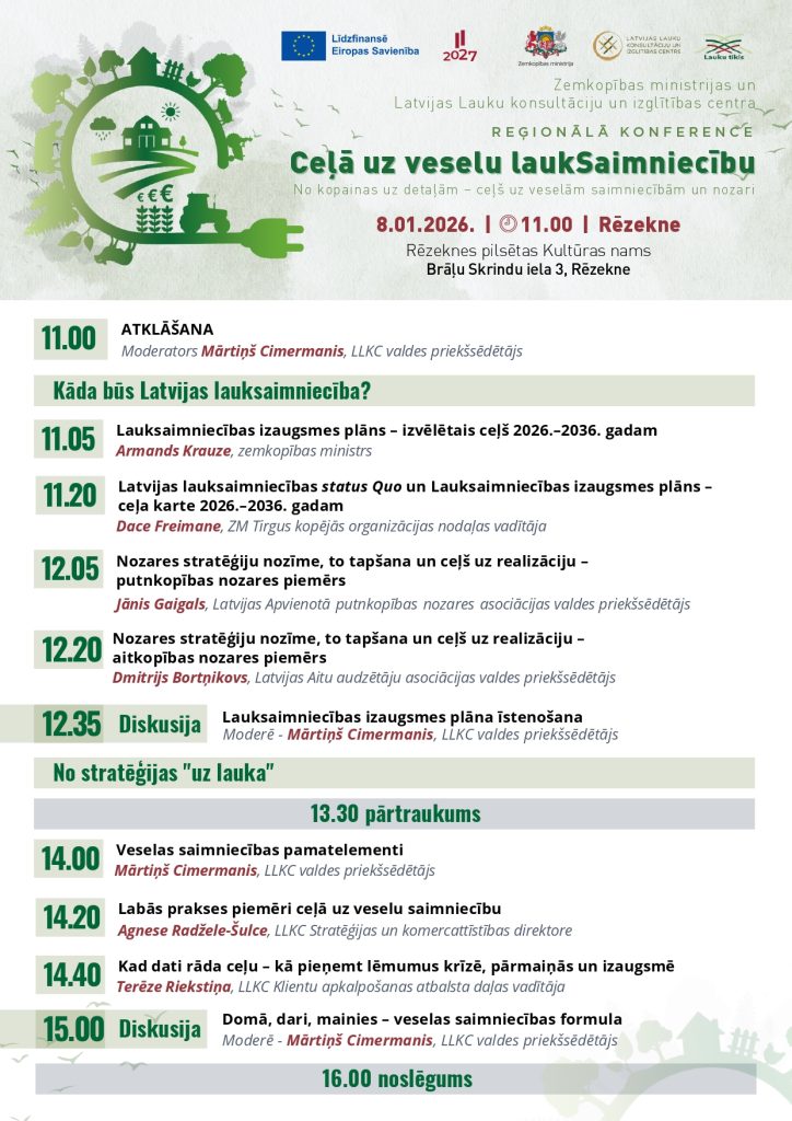 Kas īsti ir veselīga saimniecība un kāds ir Latvijas Lauksaimniecības izaugsmes plāns 2026.–2036. gadam? Par šiem un saistītiem jautājumiem 8. janvārī ZM un LLKC reģionālajā konferencē “Ceļā uz veselu lauksaimniecību” Rēzeknē spriedīs Latvijas lauksaimniecības nozares pārstāvji un eksperti.