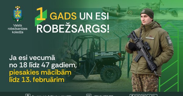 Valsts robežsardzes koledžā līdz 2026. gada 13. februārim norisinās papilduzņemšana profesionālās tālākizglītības programmā “Robežapsardze”, kas tiek īstenota par valsts budžeta līdzekļiem. Pretendentiem jābūt dienestam atbilstošam veselības stāvoklim, fiziskajai sagatavotībai, latviešu valodas, kā arī svešvalodas zināšanām (vēlamas angļu valodas prasmes), un viņi nedrīkst būt sodīti vai iesaistīti kriminālprocesā par tīša noziedzīga nodarījuma izdarīšanu.