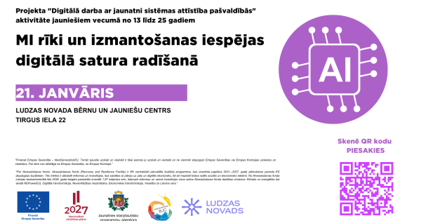 2026. gada 21. janvārī no plkst. 15.00 līdz 18.00 Ludzas novada Bērnu un jauniešu centrā projekta “Digitālā darba ar jaunatni sistēmas attīstība pašvaldībās” ietvaros norisināsies izglītojošas nodarbības jauniešiem vecumā no 13 līdz 25 gadiem “MI rīki un izmantošanas iespējas digitālā satura radīšanā”.