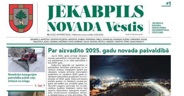 Šodien, 16. janvārī, iznācis pašvaldības izdevuma “Jēkabpils Novada Vēstis” pirmais 2026. gada numurs. Tajā var iepazīties ar lielākajiem 2025. gadā paveiktajiem darbiem, dažādiem statistikas apkopojumiem, lasīt par aktuālāko pašvaldības darbā, informāciju par projektiem, kā arī jaunumus nevalstisko organizāciju darbā un plānotajiem pasākumiem kultūrā un sportā.