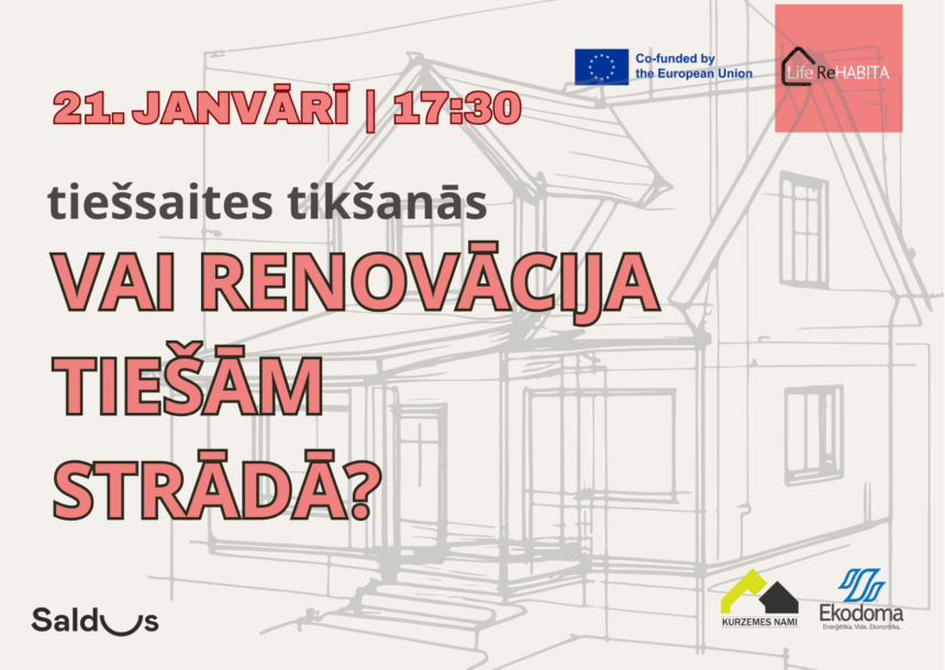 Plakāts ar virsrakstu: VAI RENOVĀCIJA TIEŠĀM STRĀDĀ? Tas aicina uz tiešsaistes tikšanos 21. janvārī pulksten 17:30. Fona redzama mājas skice. Plakāta augšpusē ir uzraksts "Co-funded by the European Union" un Life ReHABITA logotips. Apakšā redzami Ekodoma, Kurzemes Nami un Saldus logotipi, kā arī teksts: Projektu līdzfinansē no Eiropas Savienības LIFE programmas saskaņā ar granta līgumu nr. 101120713. Materiālā paustie uzskati un viedokļi ir tikai autora(-u) uzskati un viedokļi, un tie ne vienmēr atspoguļo Eiropas Savienības vai CINEA uzskatus un viedokļus. Ne Eiropas Savienība, ne CINEA nevar būt atbildīgas par šajā materiālā paustajiem uzskatiem.