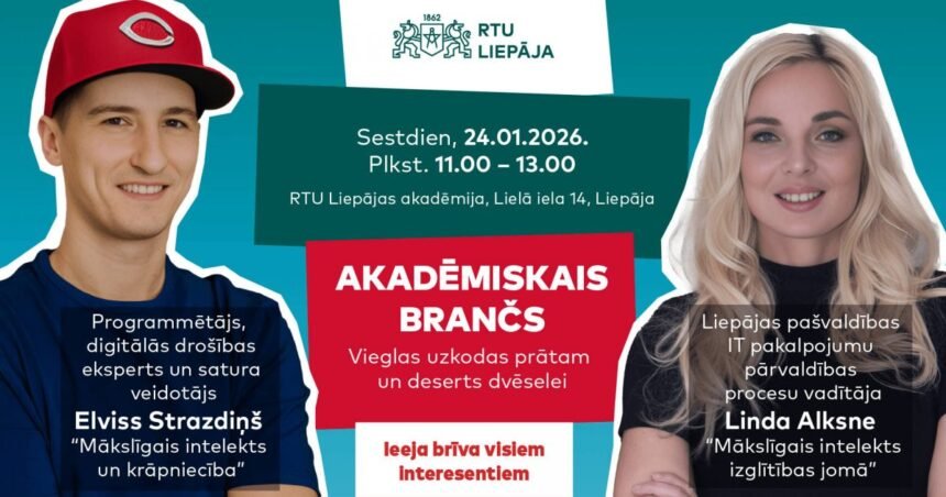 Lai sniegtu iespēju plašākam interesentu lokam iedvesmoties izzinošās lekcijās par sabiedrībā aktuālām tēmām, RTU Liepājas akadēmijā turpinās pērn aizsāktais pasākumu ciklu «Akadēmiskais brančs». Šī gada pirmais pasākums norisināsies 24. janvārī plkst. 11.00 RTU Liepājas akadēmijas Aktu zālē. Šoreiz pasākuma tēma būs mākslīgais intelekts un ar to saistītie izaicinājumi, un tajā ar lasījumiem uzstāsies Liepājas pašvaldības […]