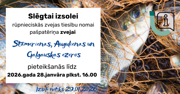 ! Izsolē var piedalīties fiziska persona, kura līdz 2025. gada 5.decembrim ir iesniegusi Gulbenes novada pašvaldībā iesniegumu par rūpnieciskās zvejas tiesību nomu pašpatēriņa zvejai.