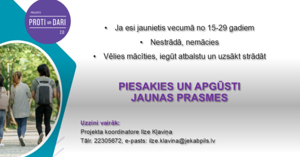 Jēkabpils novada pašvaldība sadarbībā ar Jaunatnes starptautisko programmu aģentūru veiksmīgi īsteno Eiropas Sociālā Fonda Plus (ESF+) finansēto projektu “PROTI un DARI 2.0” Nr. 4.2.3.4/1/24/I/001, kura ietvaros tiek sniegts individuāls atbalsts 30 jauniešiem vecumā no 15 līdz 29 gadiem (ieskaitot), kuri nestrādā, nemācās un nav reģistrēti Nodarbinātības valsts aģentūrā.