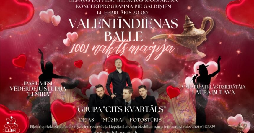 14. februārī plkst. 20.00 norisināsies romantiskām noskaņām pārbagāts vakars pašā Liepājas sirdī, kur mūzika, deja un austrumnieciska burvība saplūdīs kopā skaistā pasākumā pie galdiņiem “Tūkstoš un vienas nakts maģija”. Aicinām svinēt mīlestību sirdssiltā gaisotnē – ar dzīvo mūziku un dejām visa vakara garumā. Vakaru muzikāli atklās liepājniece un izsmalcinātās balss īpašniece Laura Bulava, kura muzicējusi […]