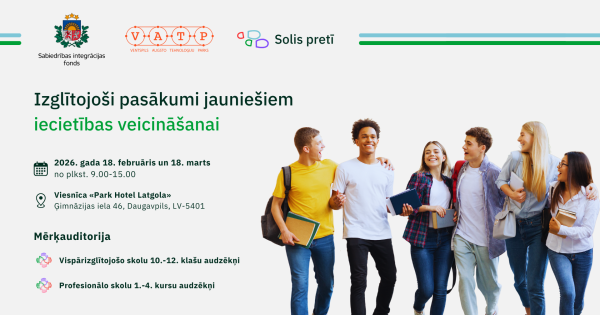 Sabiedrības integrācijas fonds un nodibinājums “Ventspils Augsto tehnoloģiju parks” īsteno bezmaksas izglītojošos pasākumus jauniešiem un pedagogiem. Pasākumi notiks Daugavpilī un to mērķis ir mazināt neiecietību jauniešu vidū, veicinot savstarpēju sapratni un kritisko domāšanu, kā arī sniegt jauniešiem un pedagogiem nepieciešamos rīkus problēmsituāciju risināšanai. Plašāka informācija un pieteikšanās šeit.