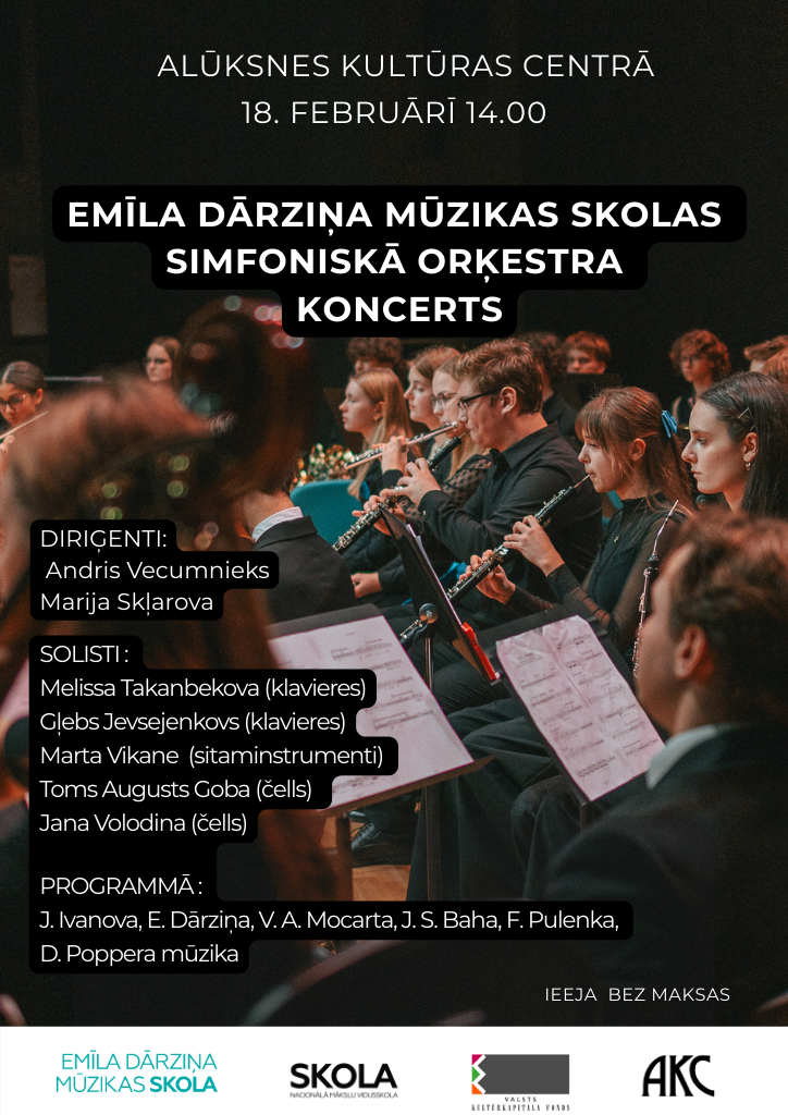 18. februārī plkst.14.00 Alūksnes Kultūras centrā izskanēs Emīla Dārziņa mūzikas skolas simfoniskā orķestra koncerts.