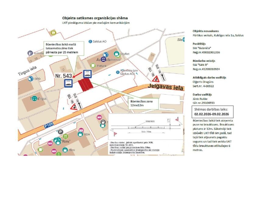 Saistībā ar darbu veikšanu Kuldīgas ielā 1A, Saldū, laika posmā no 2026. gada 2. februāra līdz 9. februārim būs spēkā pagaidu transporta kustības organizācijas shēma.