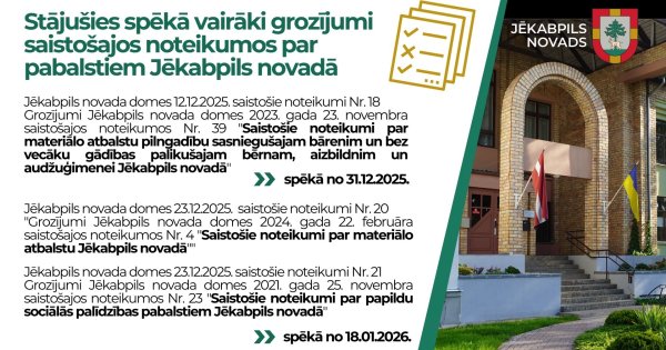 2026. gada 18. janvārī stājušies spēkā grozījumi Jēkabpils novada domes 2024. gada 22. februāra saistošajos noteikumos Nr. 4 “Saistošie noteikumi par materiālo atbalstu Jēkabpils novadā” un Jēkabpils novada domes 2021.gada 25.novembra saistošajos noteikumos Nr. 23 “Saistošie noteikumi par papildu sociālās palīdzības pabalstiem Jēkabpils novadā”.