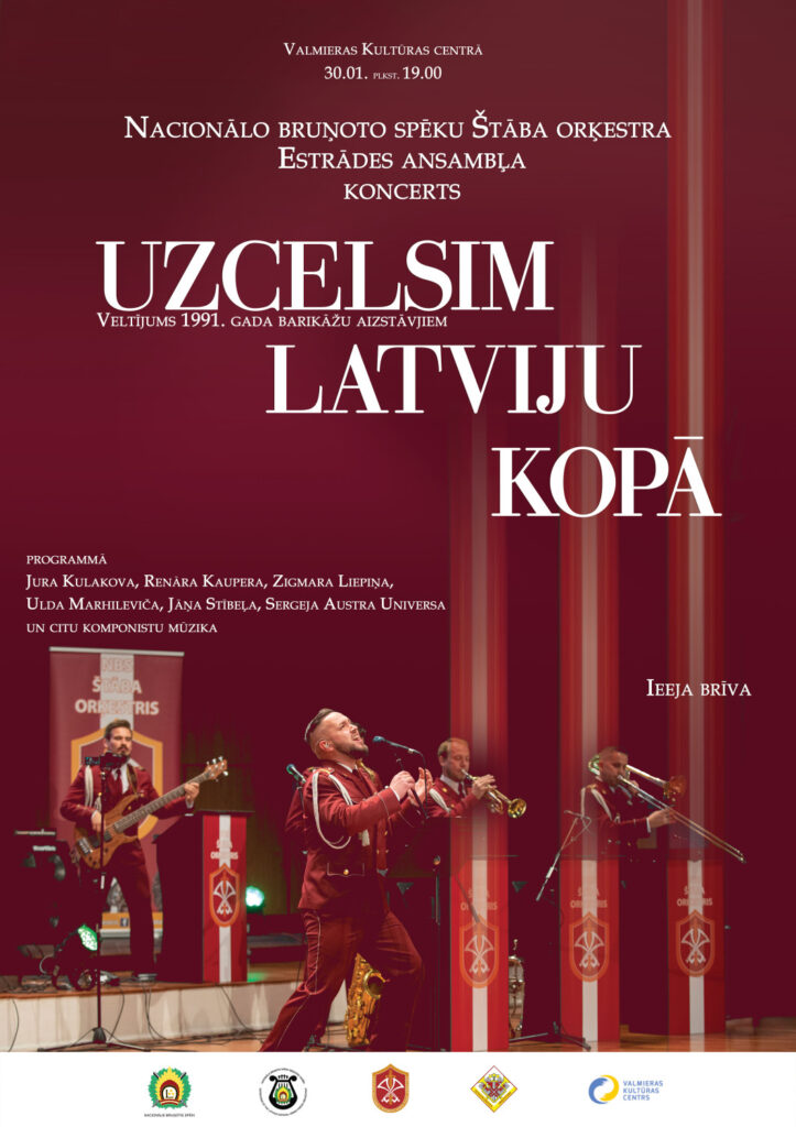 Janvāra barikāžu laiks Latvijas vēsturē iezīmējas ar notikumiem, kas apliecina tautas vienotību un spēku. Pieminot un godinot mūsu valsts aizstāvjus, Nacionālo bruņoto Štāba orķestra estrādes ansamblis ir sagatavojis īpašu koncertprogrammu “Uzcelsim Latviju kopā”. Valmieras Kultūras centrā Nacionālo bruņoto spēku Štāba orķestra estrādes ansambļa koncerts “Uzcelsim Latviju kopā!” skanēs 30. janvārī plkst. 19.00.
