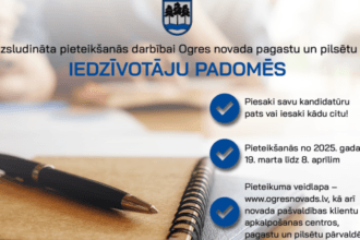Ogres novada paÅ”valdÄ«ba aicina iesniegt kandidÄtu pieteikumus, lai izveidotu iedzÄ«votÄju padomes Ogres novada pagastos un pilsÄtÄs. Pieteikumu iesniegÅ”anas…