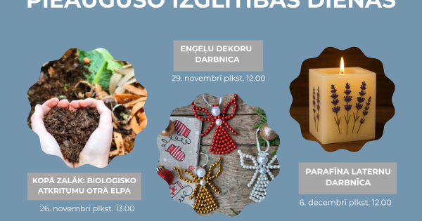 CienÄ«jamie Ädažu novada iedzÄ«votÄji! AicinÄm jÅ«s piedalÄ«tiesĀ PieauguÅ”o izglÄ«tÄ«bas dienÄs!Ā DalÄ«ba darbnÄ«cÄs ir bez maksas, bet ar iepriekÅ”Äju reÄ£istrÄciju. KopÄ zaļÄk: bioloÄ£isko atkritumu otrÄ elpa,26.novembrÄ«, plkst. 13.00, Carnikava, Stacijas iela 5 AicinÄm…