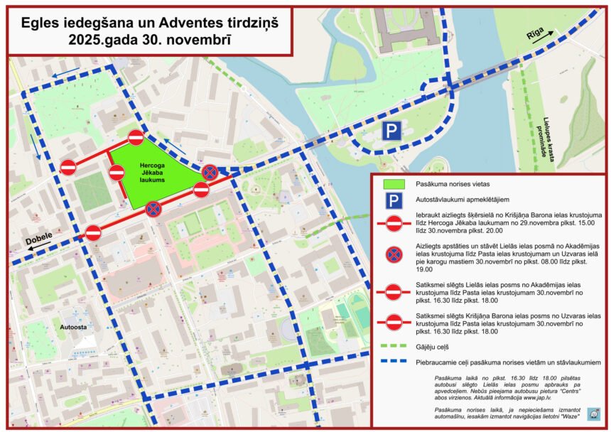 SvÄtdien uz laiku bÅ«s slÄgts LielÄs ielas posms; pilsÄtas autobusi to apbrauks pa apvedceļiem PirmajÄ adventÄ, 30. novembrÄ«, pulksten 17 Hercoga JÄkaba laukumÄ kopÄ«gi iedegsim pilsÄtas lielo egli. IedzÄ«votÄjiem jÄÅem…
