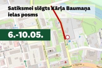 No 6. līdz 10. maijam satiksmei slēgts Kārļa Baumaņa ielas posms no iebrauktuves Kārļa Baumaņa ielas Nr. 9…