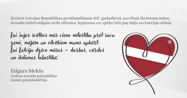 Sveicot Latvijas Republikas proklamÄÅ”anas 107. gadadienÄ, novÄlam ikvienam mÅ«su novada iedzÄ«votÄjam sirds siltumu, lepnumu un spÄku bÅ«t par daļu no Latvijas stÄsta. Lai Å”ajos svÄtkos mÅ«s vieno mÄ«lestÄ«ba pret savu…